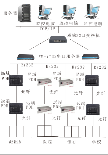 局端每台PDH设备"CONSOLE"口与串口通讯服务器的串口相连; 远端PDH通过光纤通信与局端PDH设备相连;