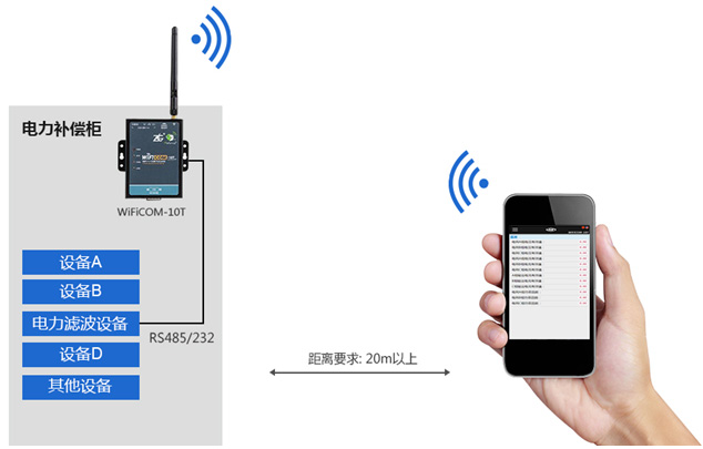 电力补偿装置的巡检一般需要人工开柜进行数据的查看、调整等操作,工作繁琐切具有一定危险性,本项目利用WiFiCOM-10T串口转Wi-Fi模块,在传统装置的基础上利用原有的RS-485/232通讯接口快速进行产品升级,将串口数据转化成Wi-Fi信号,巡检人员即可通过手机或iPad进行设备巡检,并实现遥控、遥测、遥信等功能。
